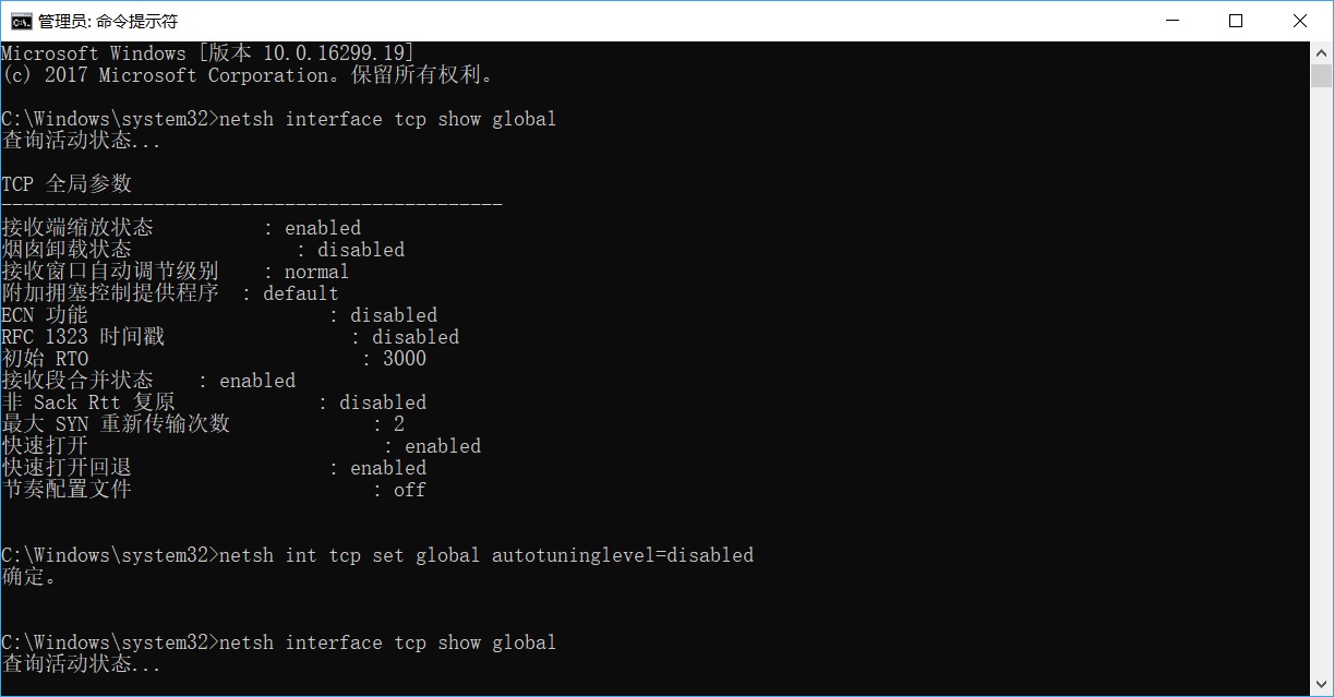 2、键入netsh interface tcp show global并回车;